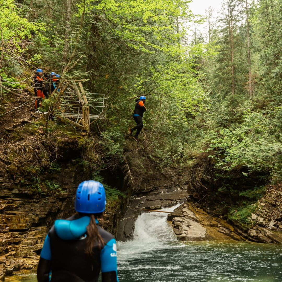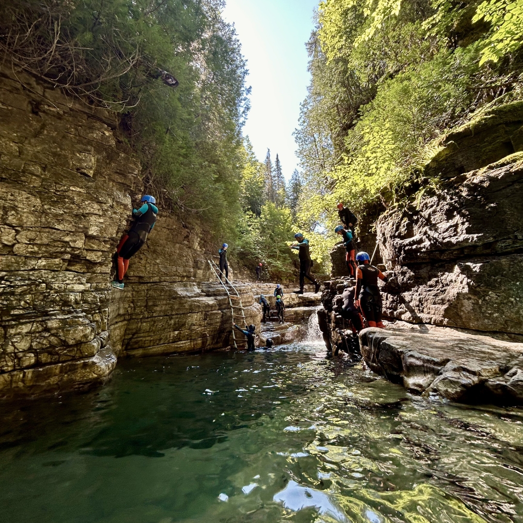 Le Canyonisme (canyoning), c’est comme des glissades d’eau, mais en nature! Notre activité consiste à parcourir un cours d’eau accidenté en randonnée, à la nage ou en glissant (nous ne faisons pas de rappel). Le parcours, forgé par des milliers d’années d’écoulement des eaux vous en offrira pour tous les goûts; de la nage et des glissades pour les plus tranquilles, des sauts et des parois pour les aventuriers et aventurières.
